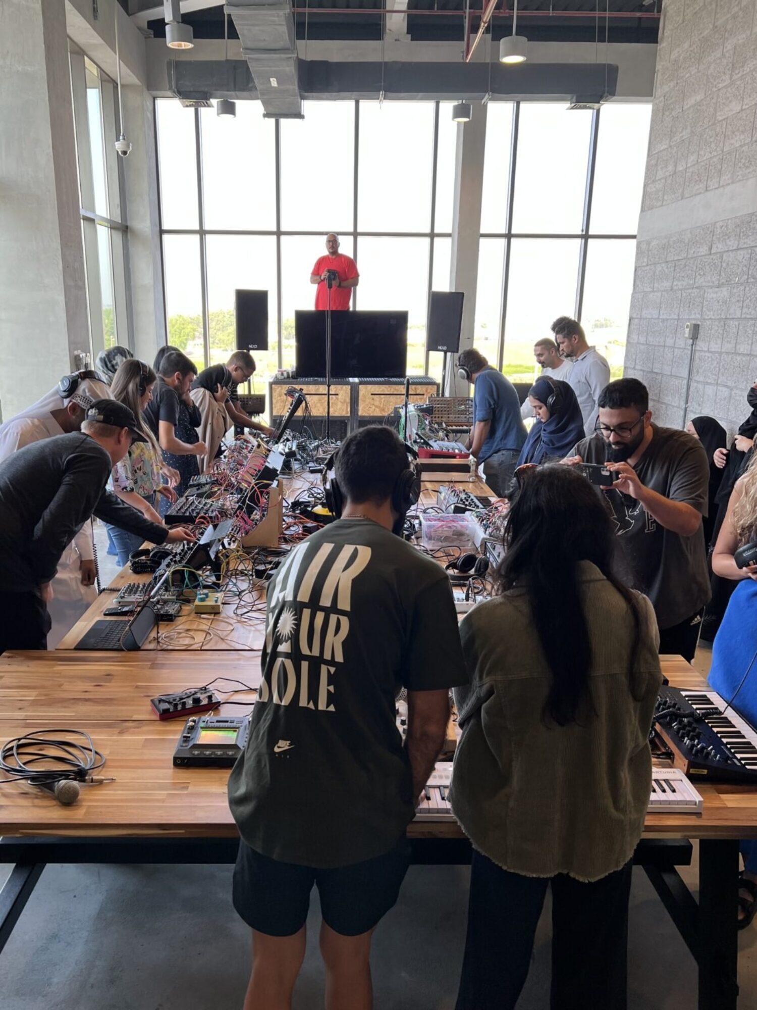 An event led by Overlap Record Studio in Lusail. Overlap Studio invited Sonic Jeel to co-direct and perform in the first ever Modular Synth Meet-Up in Qatar at the Fire Station. The event showcased 8 selected experimental electronic musicians from Qatar to engage in a 3-hour workshop plus performance to select public guests.